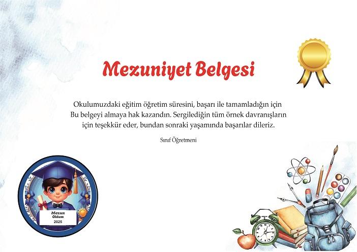 Mezuniyet Belgeleri Mezuniyet Belgeleri kişiye özel tasarımda yapılabilir. İsteğe bağlı.Başarı belgesi, Mezuniyet belgesi ve Okuma belgesi ( Artık Okuyorum Belgesi ) gibi belgelerimiz mevcuttur. Mezuniyet belgeleriyle öğrencilerinizin yıllarca saklayacağı öğrencilerinize hoş bir anı bırakın.