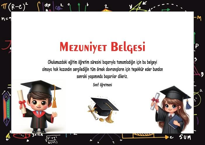 Mezuniyet Belgeleri  Mezuniyet Belgeleri kişiye özel tasarımda yapılabilir.İsteğe bağlı.Başarı belgesi,Mezuniyet belgesi ve Okuma belgesi ( Artık Okuyorum Belgesi )  gibi belgelerimiz mevcuttur.  Mezuniyet belgeleriyle öğrencilerinizin yıllarca saklayacağı öğrencilerinize hoş bir anı bırakın.