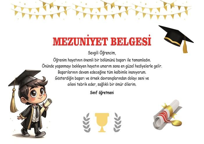 Mezuniyet Belgeleri  Mezuniyet Belgeleri kişiye özel tasarımda yapılabilir.İsteğe bağlı.Başarı belgesi,Mezuniyet belgesi ve Okuma belgesi ( Artık Okuyorum Belgesi )  gibi belgelerimiz mevcuttur.  Mezuniyet belgeleriyle öğrencilerinizin yıllarca saklayacağı öğrencilerinize hoş bir anı bırakın.