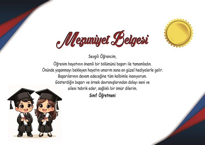 Mezuniyet Belgeleri Mezuniyet Belgeleri kişiye özel tasarımda yapılabilir.İsteğe bağlı.Başarı belgesi,Mezuniyet belgesi ve Okuma belgesi ( Artık Okuyorum Belgesi ) gibi belgelerimiz mevcuttur. Mezuniyet belgeleriyle öğrencilerinizin yıllarca saklayacağı öğrencilerinize hoş bir anı bırakın.